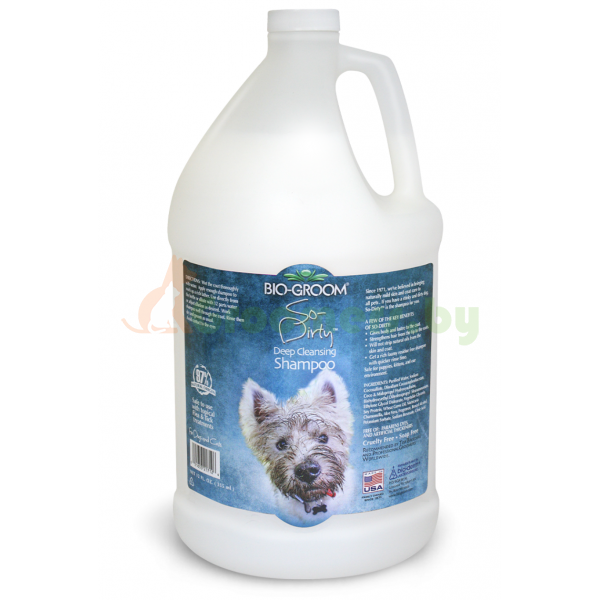 Bio-Groom So Dirty Deep Cleansing – шампунь, предназначенный для грязной и очень неприятно пахнущей шерсти. Тщательно очищает, удаляет загрязнения и неприятные запахи. Идеально подходит в качестве шампуня для первого мытья. Средство не влияет на эффективность препаратов длительного действия против блох и клещей. Рекомендованный лучшими заводчиками и профессиональными грумерами по всему миру, он отлично подойдет в любом салоне по уходу за домашними животными. Не содержит мыла, придает шерсти выразительность и блеск. Не удаляет натуральные масла с кожи и шерсти. Так что Dirty отлично пенится и смывается.