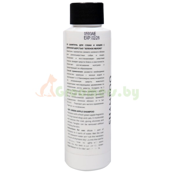 Шампунь Iv San Bernard Traditional Line Green Apple для длинной шерсти Шампунь с ароматом зеленого яблока для длинношерстных собак и кошек. Увлажняет, и восстанавливает покров, смягчает и придает шерсти блеск. Облегчает расчесывание, помогает удалять колтуны, не раздражая кожу животного. Способ применения: разбавить 1 часть шампуня 3 частями воды. Нанести шампунь на предварительно смоченную шерсть. Легкими движениями втирайте в течение нескольких минут, Тщательно ополоснуть теплой водой. Для наилучшего результата после использования шампуня, применяйте кондиционер «Green Apple» от Ив Сан Бернард.