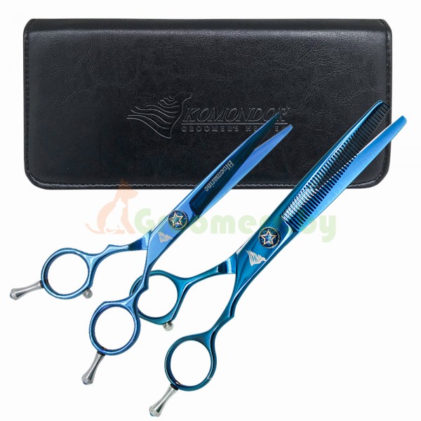 Komondor Bluemarine, ножницы прямые, ножницы филировочные, комплект ножниц, набор грумера, груминг-инструменты, ножницы для учеников, чехол в подарок