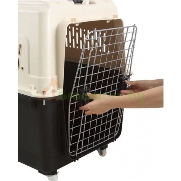 Переноска для животных оснащены специальными колесами с режимом торможения. Также в наборе прилагается миска для воды, закрепленная на дверце. Сама дверь оборудована замком, чтобы собака не сбежала. Переноска для животных в салон самолета — это удобный вариант путешествия с четвероногим любимцем.