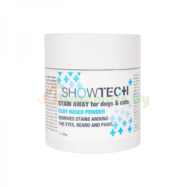 Идеальное решение - пудра Show Tech+ Away - это порошок на основе глины, который помогает удалить неприглядные слезные пятна вокруг глаз, бороды и лап как у собак, так и у кошек. Его ингредиенты натуральные и не вызывают раздражения, что делает эту пудру нежной, но эффективной.