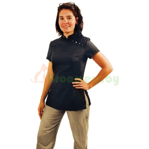 Рубашка изготовлена из 100% полиамид. Ткань предотвращает прилипание шерсти, имеет антистатический эффект, не пропускает воду и быстро высыхает при попадании на неё воды. Не мнётся, стирать при температуре не более 30°С, не гладить. Быстрая сушка.