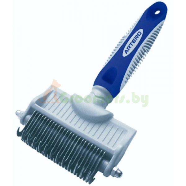 Двухсторонний стриппинг от популярного испанского производителя товаров для животных компании Artero имеет удобную прорезиненную ручку и две рабочие стороны с разным расстоянием между зубцами для удобной работы грумера. Стриппинг отлично справляется с вычесыванием выпавшей во время линьки шерсти и распутыванием сложных колтунов.